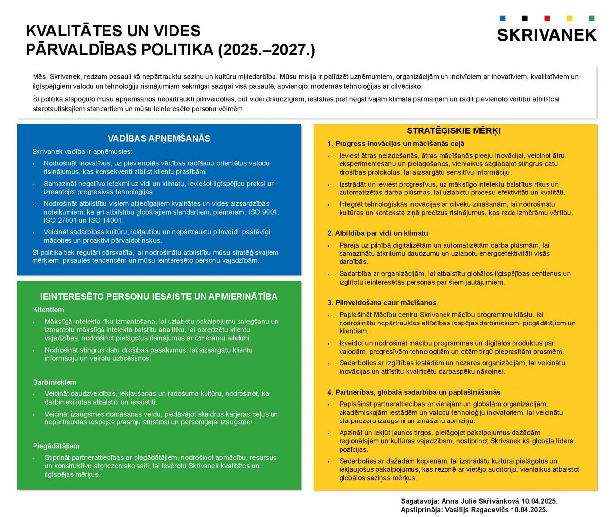 Skrivanek kvalitātes un vides pārvaldības politikas infografika 2025.–2027. gadam ar sadaļām par vadības apņemšanos, ieinteresēto personu iesaisti un stratēģiskajiem mērķiem zilā, zaļā un dzeltenā blokā.